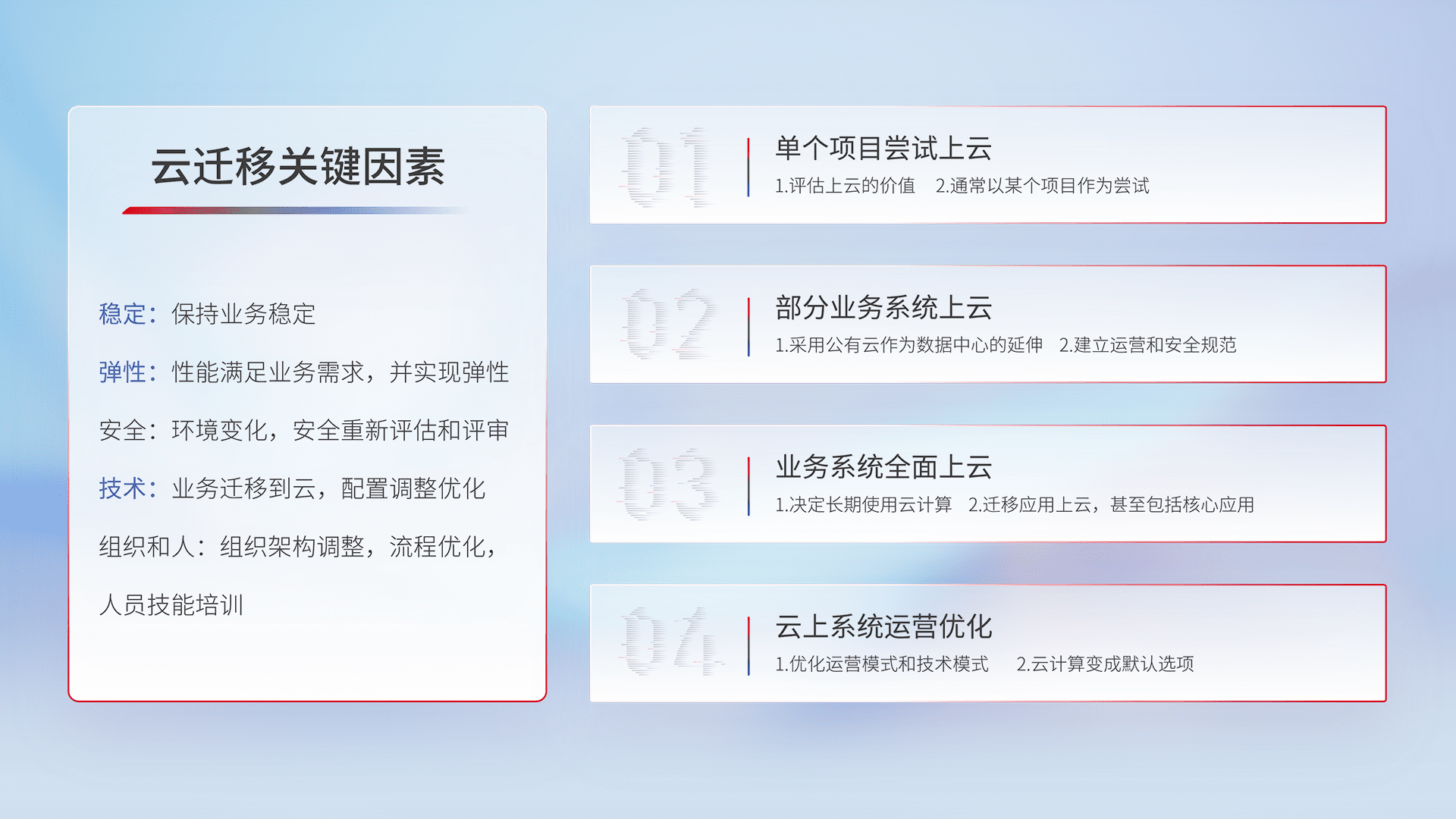 结合实际业务,,从规划设计、、、、云平台选型、、云原生改造、、、数据迁移、、、、集成交付,,,迁移全过程为客户识别最佳上云路径,,,,做好风险识别管理,,,,设计网络架构、、、、身份权限、、、安全审计合规、、操作审计、、日志审计、、、、监控告警策略、、、多站点容灾设计等,,,,对云上基础设施进行整体规划,,,提升IT治理水平,,以满足弹性、、、高可用、、、、高性能的需求。。