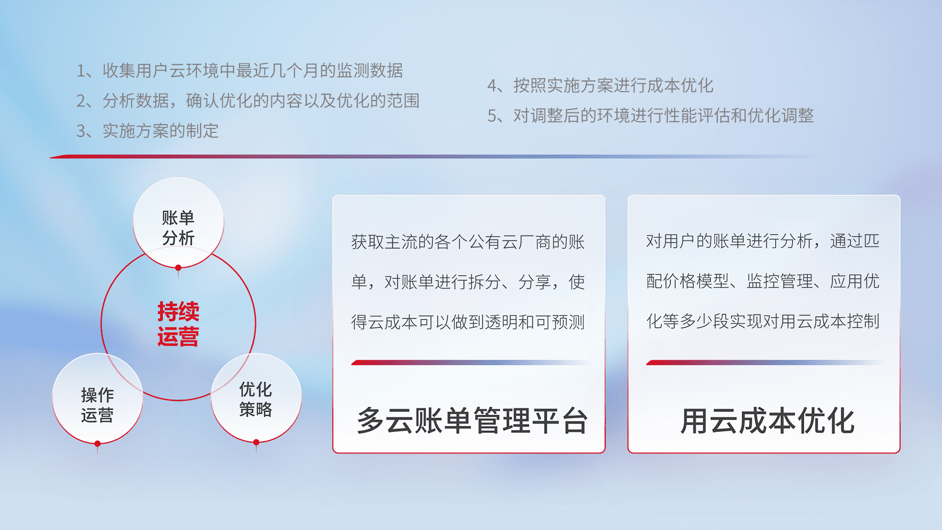通过多云纳管,,,,以统一的资源数据模型把客户的云资源进行抽象和封装,,,,进而实现对多云资源的统一操作,,,保障云资源管理的可靠性、、稳定性与可用性。。。量身定制化运维内容,,,,配置、、、、开发运维、、补丁管理、、、、备份、、、、监控、、认证和访问管理、、、、审计和日常巡检等,,,,保障在用云过程中的可靠度,,,稳定度以及高可用率。。。