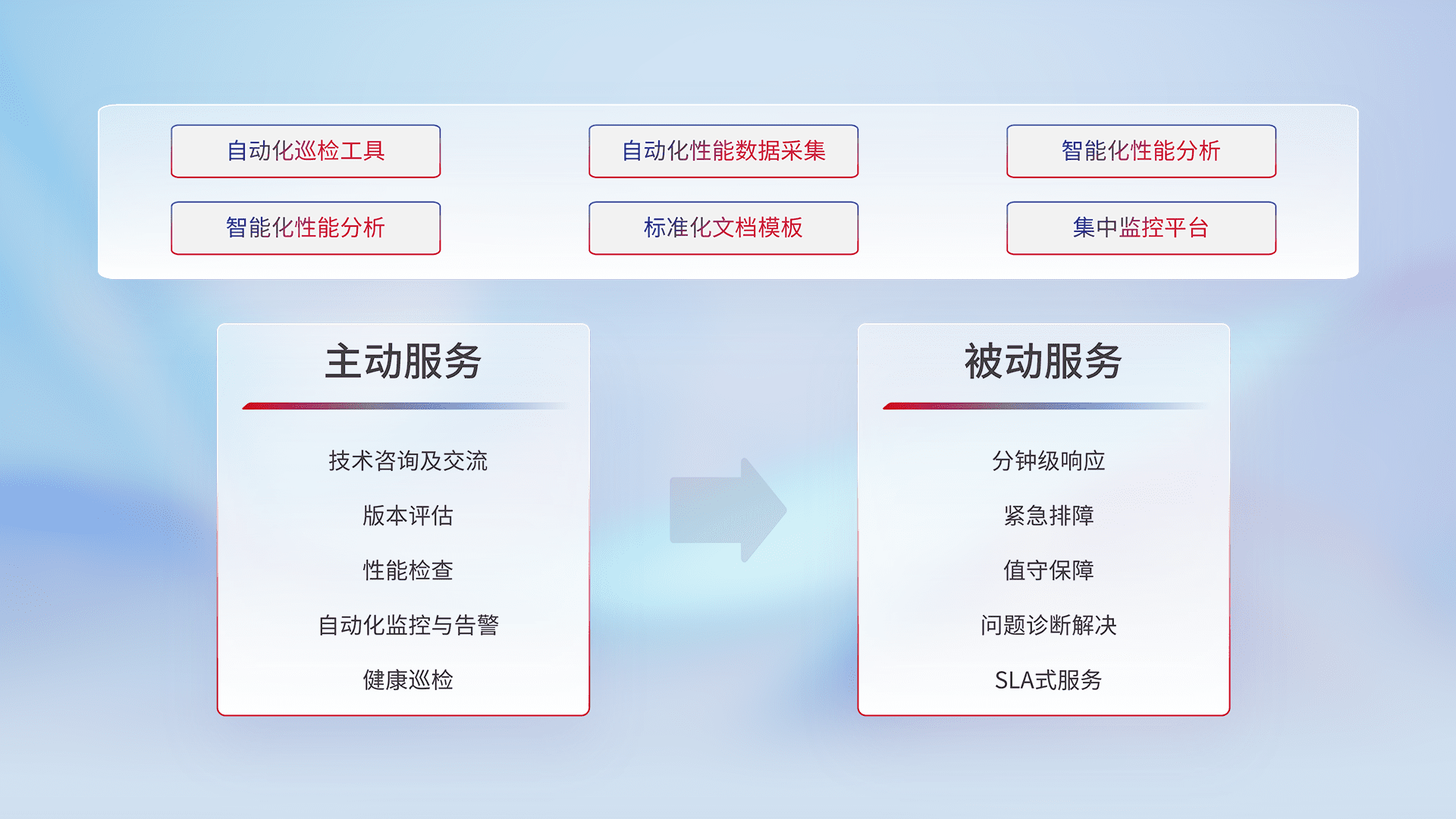 智能化工具和标准化文档,,保障服务质量,,,提供主动服务(包含技术咨询、、、版本评估、、、性能检查、、自动化监控与告警、、健康巡检)和被动服务包含(分钟级响应、、、紧急排障、、值守保障、、问题诊断解决、、SLA服务)。。。。